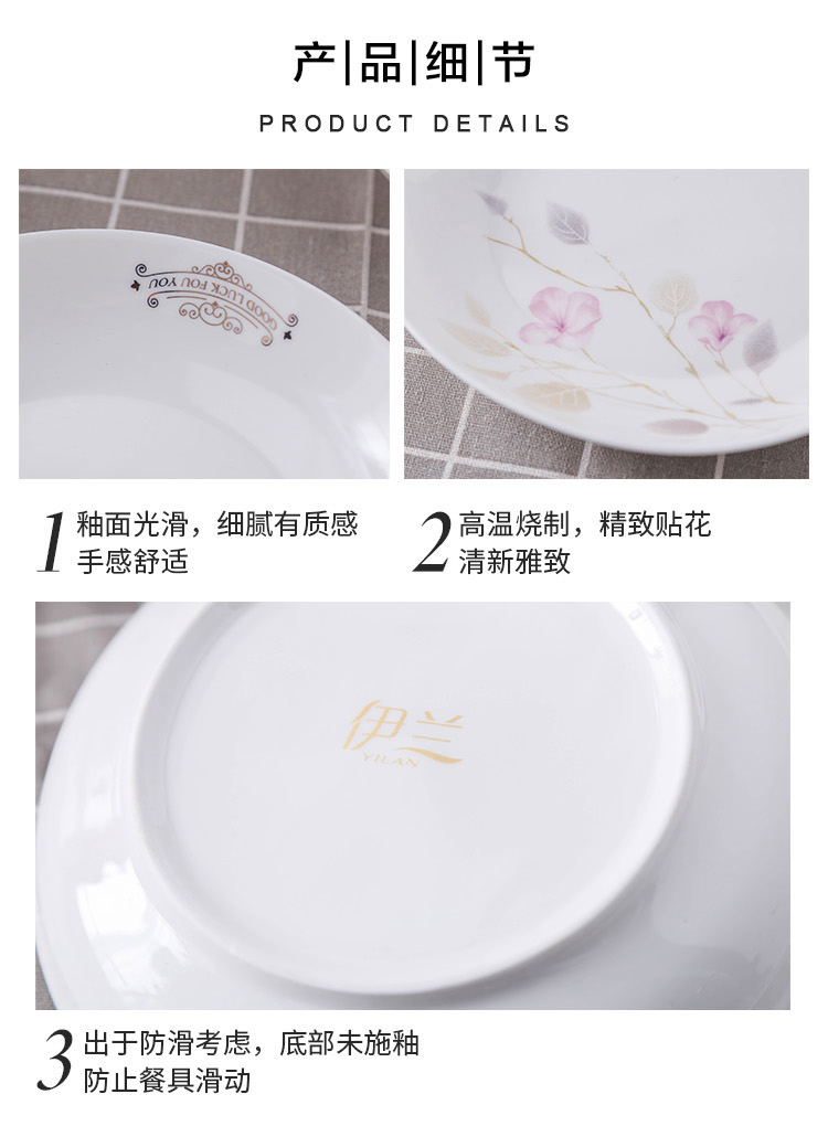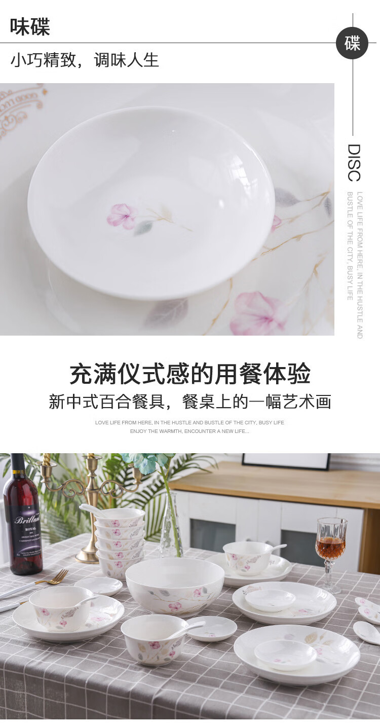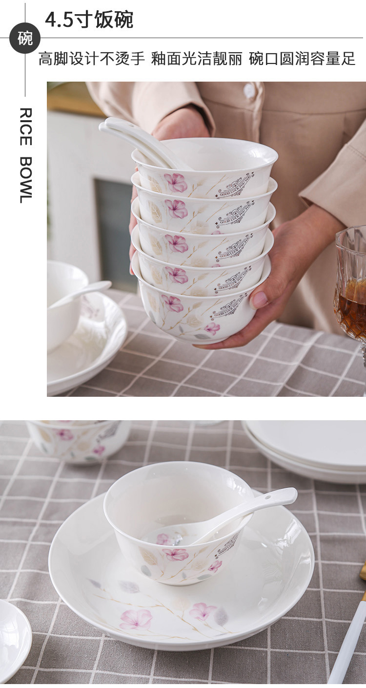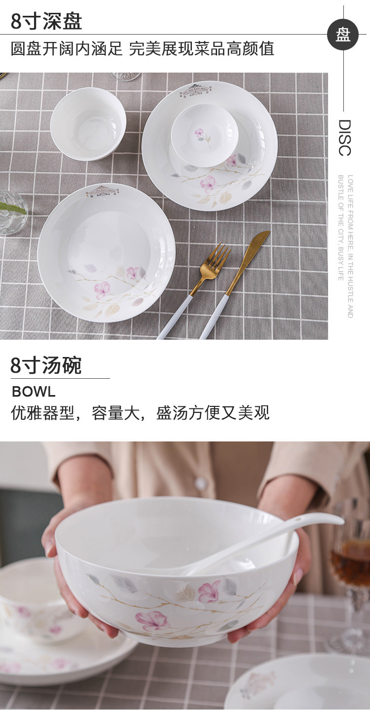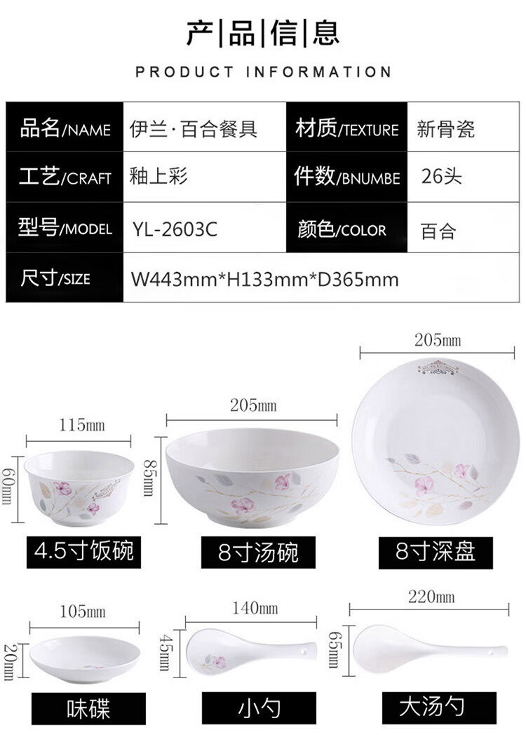产品规格:4.5金钟碗*8个 、 小汤勺* 8个 8寸饭盘*4个、8寸汤碗 * 1个 大汤勺* 1个 、 小吃碟* 4个