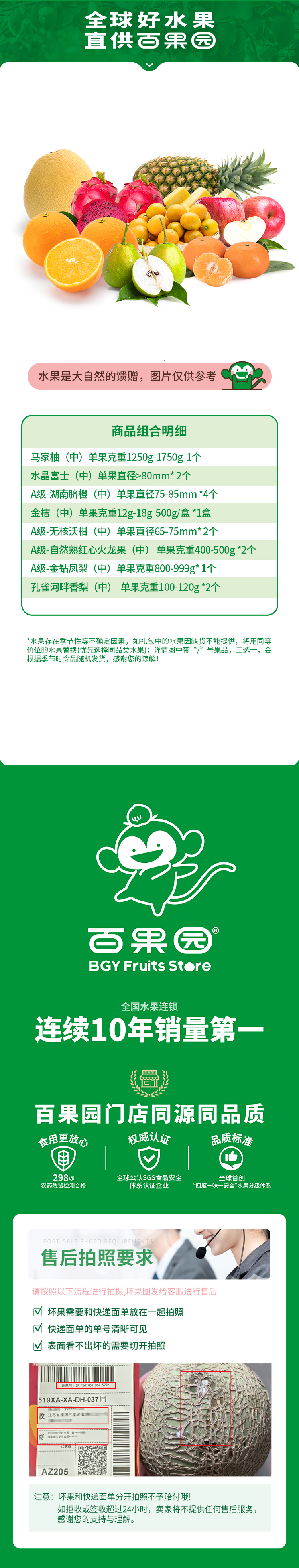 售前提示: 1、生鲜水果具有时令性,不同果品需根据产季不同进行更换,我们将每周监测果品情况及品质变化 2、如遇不可抗力因素导致果品临时缺货等情况,我们将以等价值果品进行替换 3、不发货区域:西藏、新疆、内蒙古、青海、黑龙江、吉林、辽宁、四川(甘孜州、阿坝州、凉山州)、港澳台及物流异常区域。