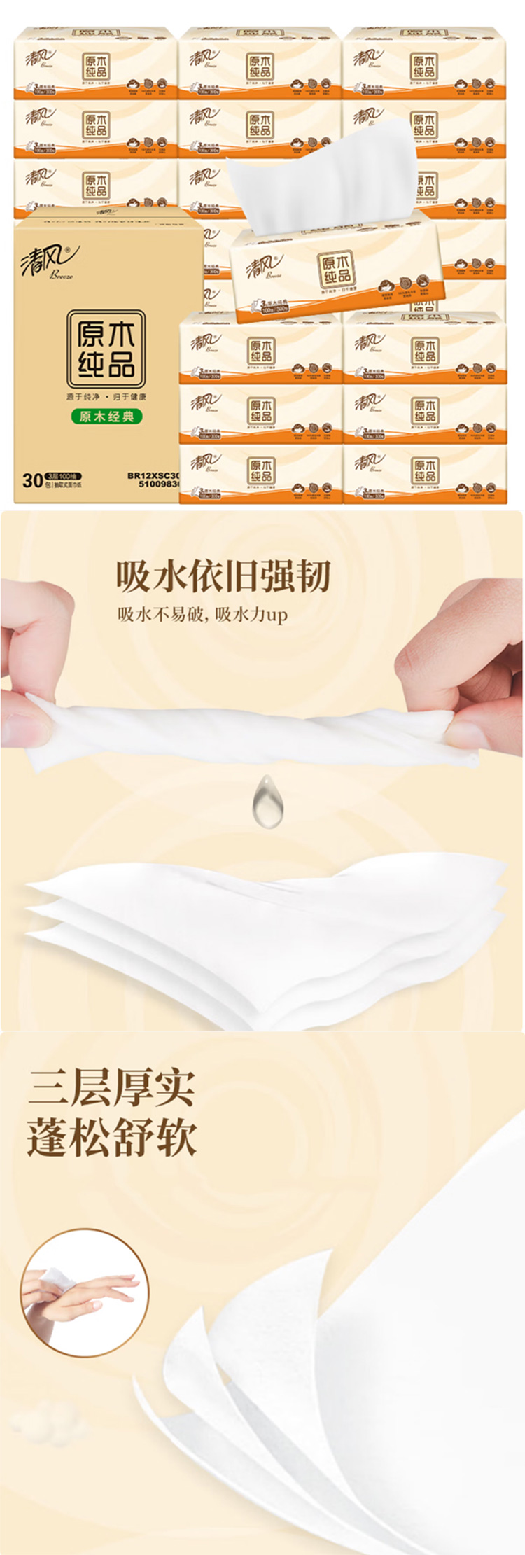 清风纸巾抽纸 3层 100抽*30包