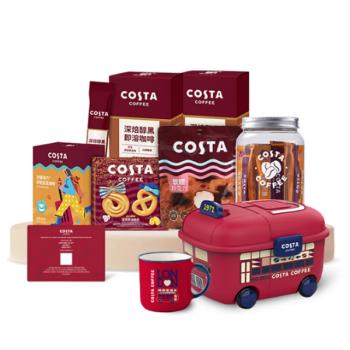 内含(产品包装随机发货):海盐太妃糖 98g*1 ,皇家黄油曲奇60g*1 ,软糯巧克力(牛奶风味)58g *1 ,浓郁黑巧拼配挂耳咖啡 40g*1, 深焙醇黑即溶咖啡12.6g*2, COSTA英伦复古巴士储物箱11.3L*1, COSTA英伦复古巴士马克杯370ml*1, COSTA中杯手工饮品买一送一券× 2张, COSTA食品7折券× 1张, COSTA零售商品7折券 × 1张, *三款券均可在COSTA线下直营门店使用