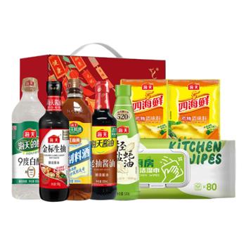 海天金标生抽598g(PET瓶)*1瓶 海天老抽酱油500mL(PET瓶)*1瓶 海天精制料酒800mL(PET瓶)*1瓶 海天9度白醋800mL(PET瓶)*1瓶 海天轻盐蚝油520g(PET瓶)*1瓶 海天四海鲜鸡精40g*2袋 海氏海诺乐一享三厨房清洁湿巾(80抽)*1包